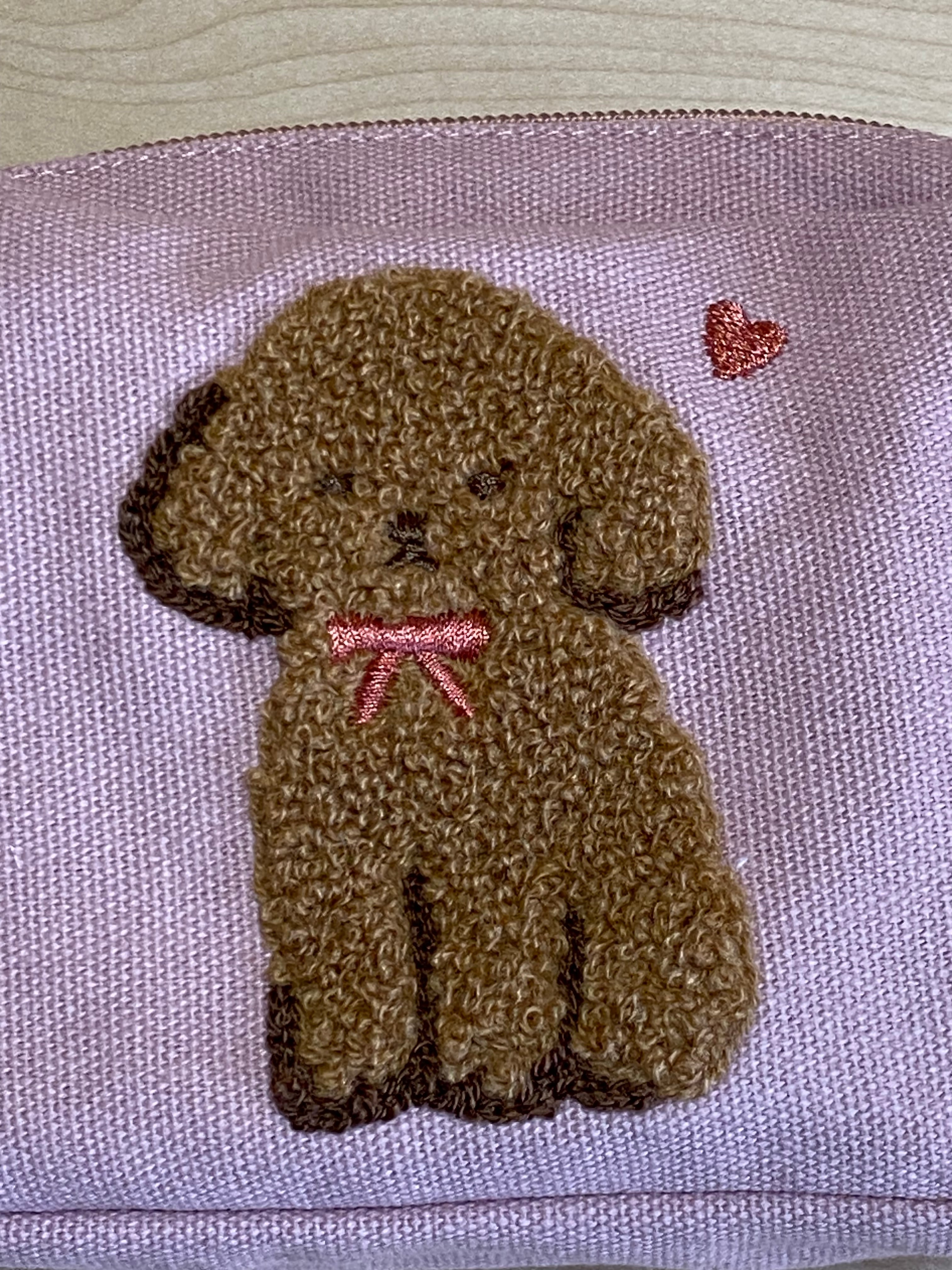 もこもこした立体的なトイプードルの刺繍がかわいいポーチ。キャンバス地でしっかりしています。