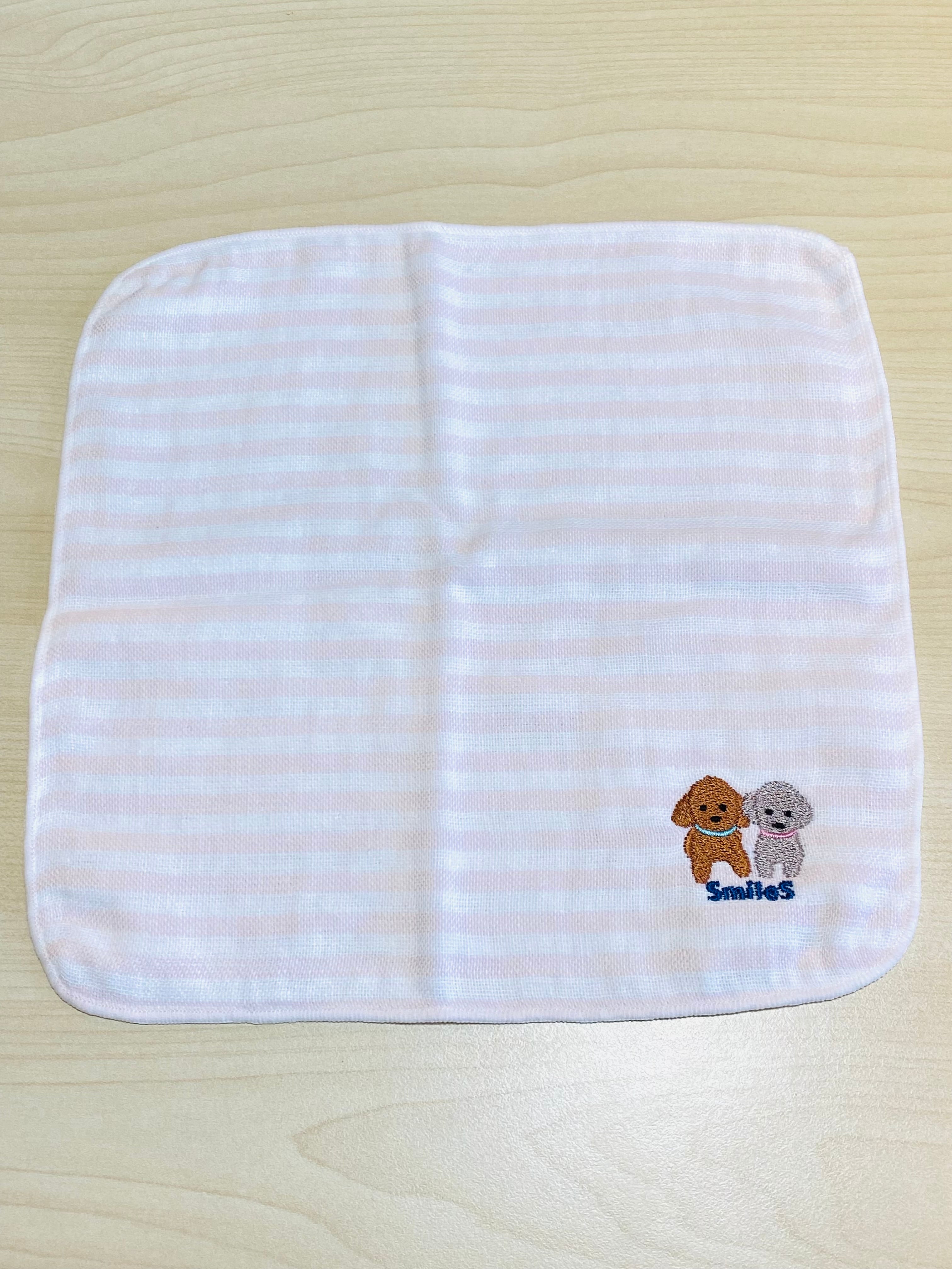スマイルズの看板犬ラッキーとマリエの刺繍ガーゼタオル。(刺繍デザイン Laras DESIGN)