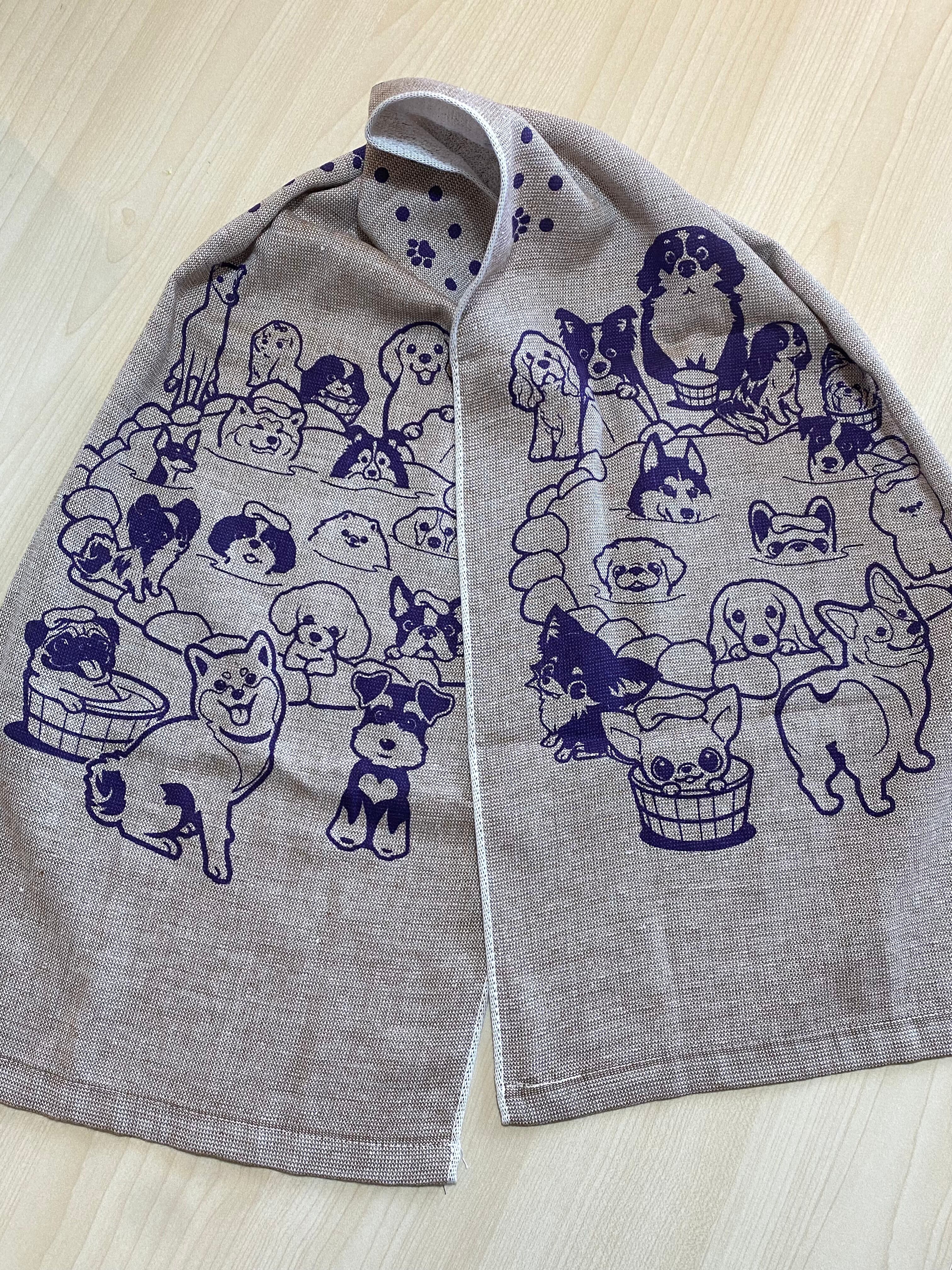 30犬種のわんこたちが温泉に入っている、「まいわんちょ」さんデザインのガーゼのフェイスタオル。