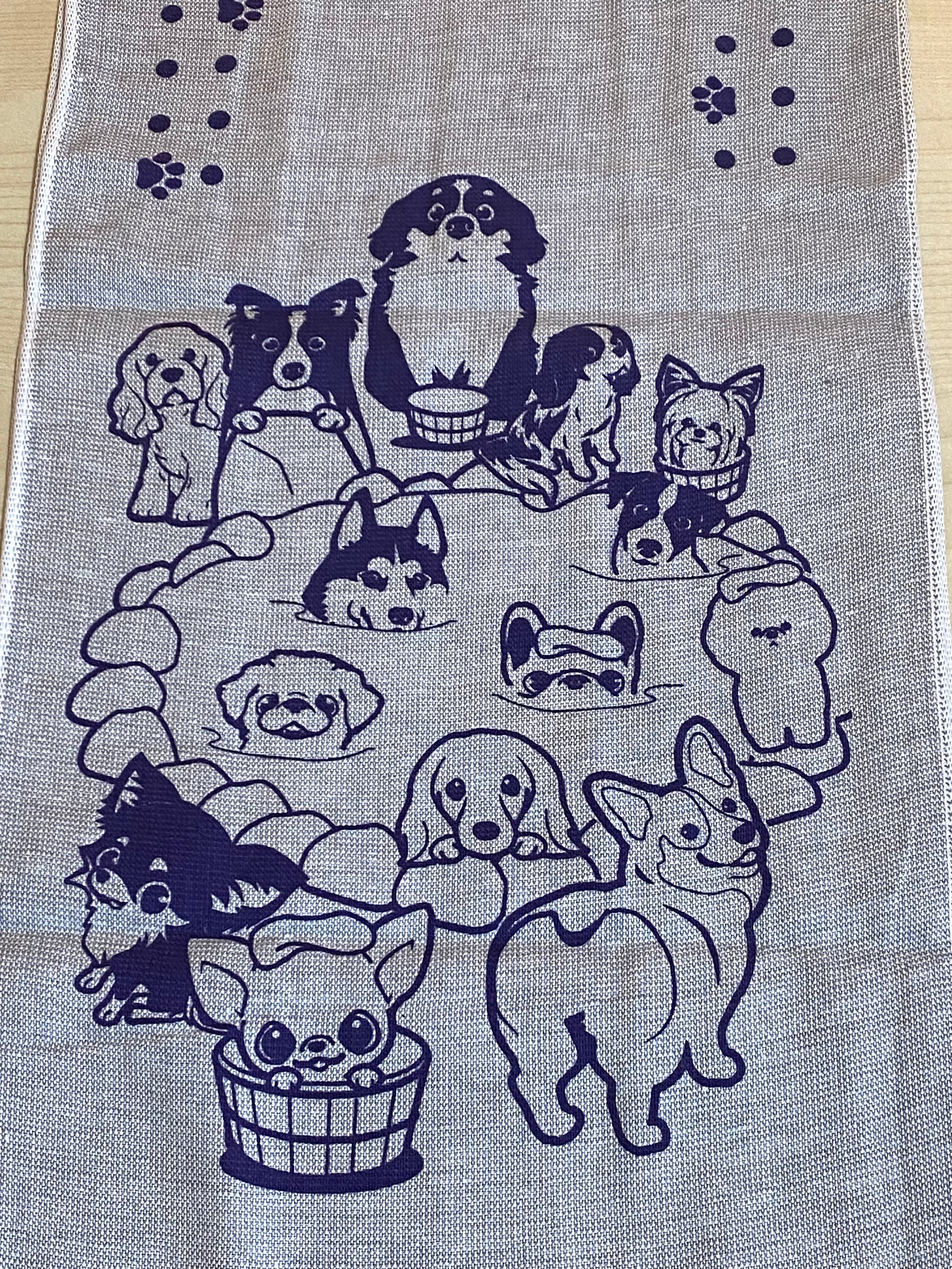 30犬種のわんこたちが温泉に入っている、「まいわんちょ」さんデザインのガーゼのフェイスタオル。