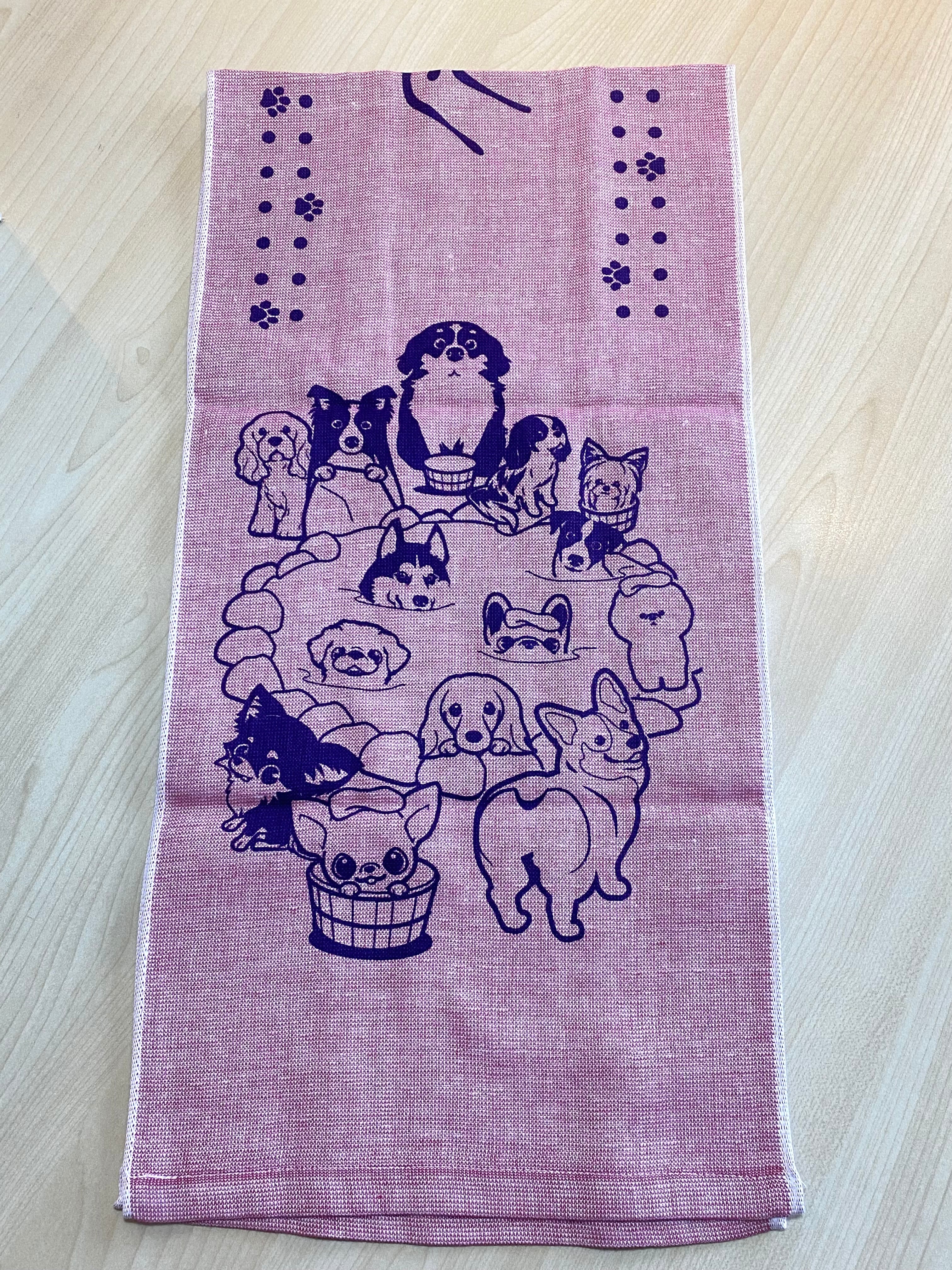 30犬種のわんこたちが温泉に入っている、「まいわんちょ」さんデザインのガーゼのフェイスタオル。