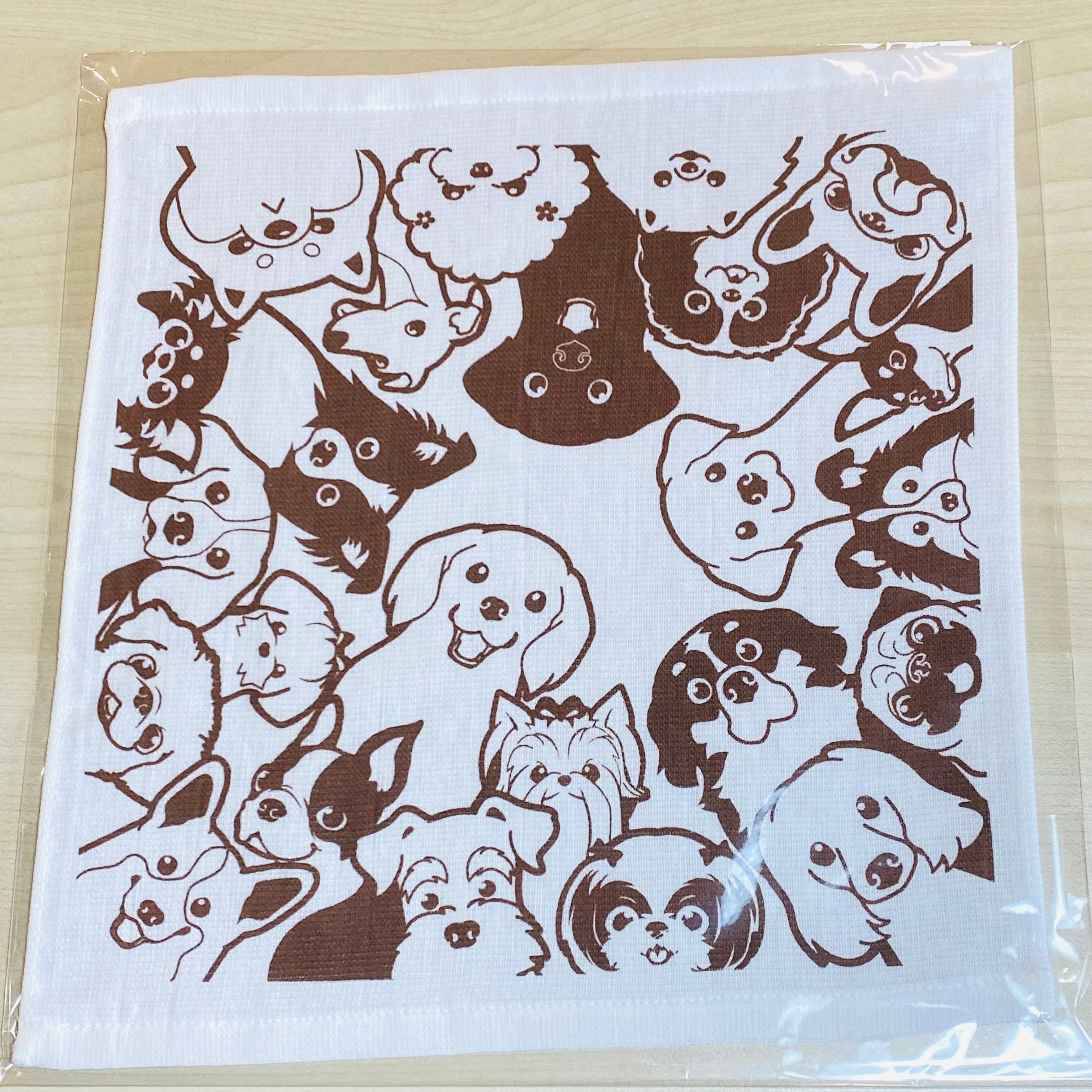 「まいわんちょ」さんデザインの、かわいいわんこたちが大集合したガーゼハンカチ。