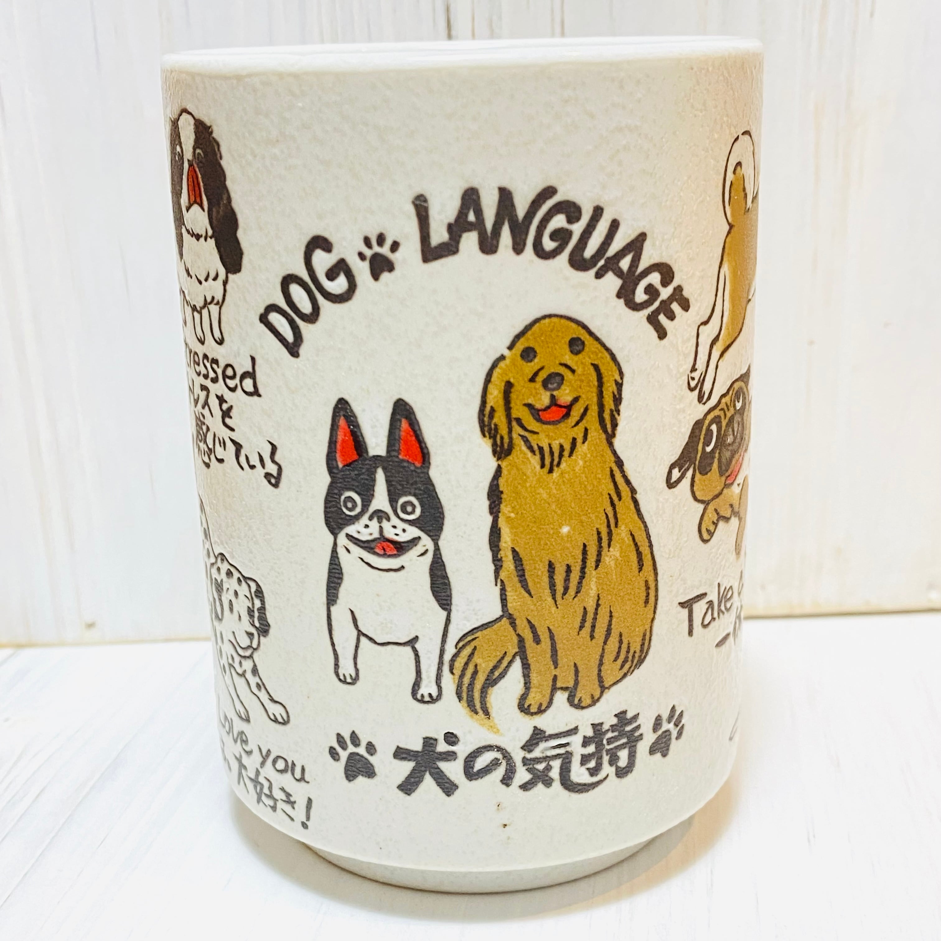 ポーズから分かる犬たちの気持ちを、英語と日本語で描いた楽しい湯呑。