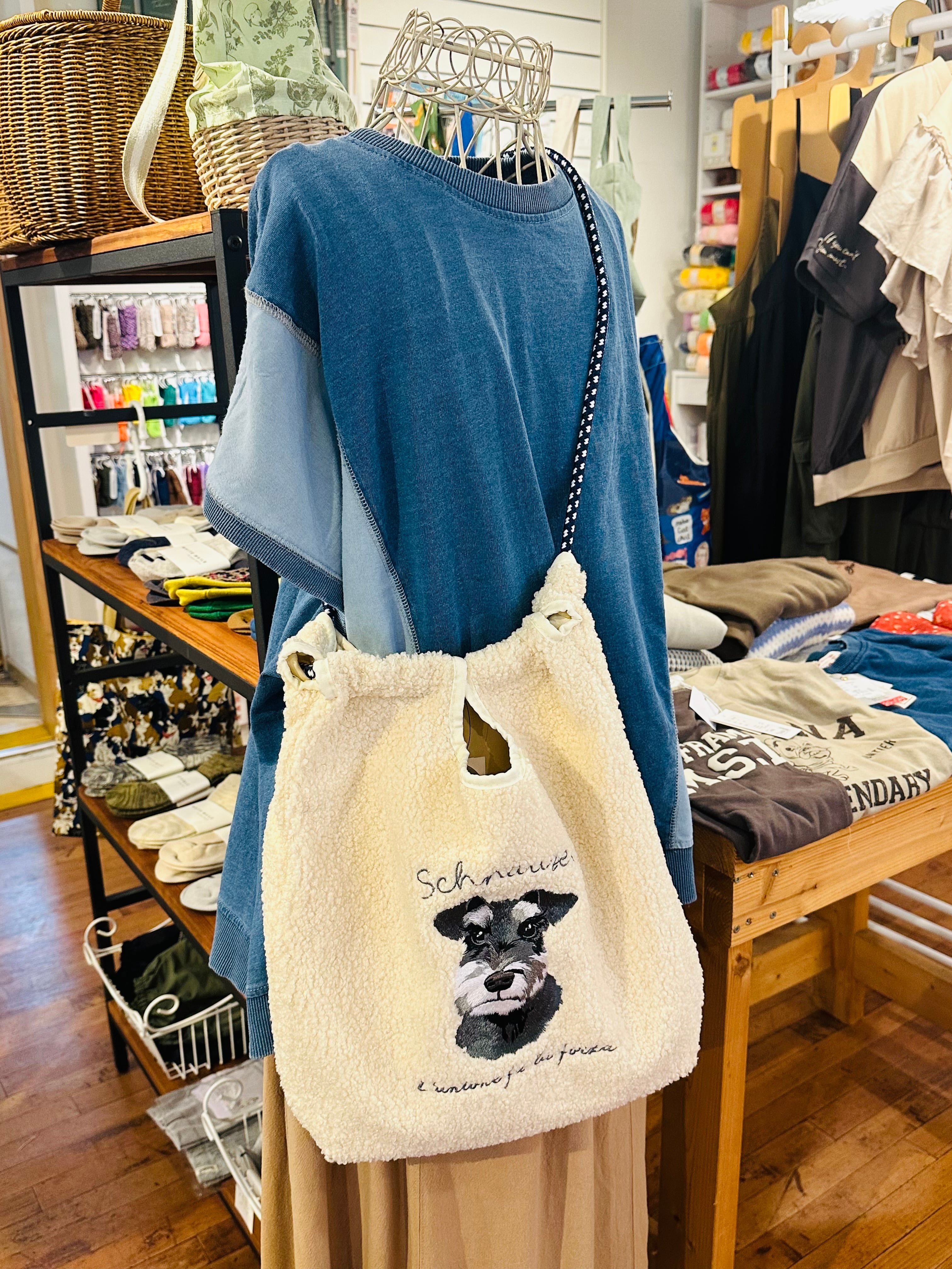 ボアに愛嬌のある表情のワンコの刺繍がポイントのコードトート。