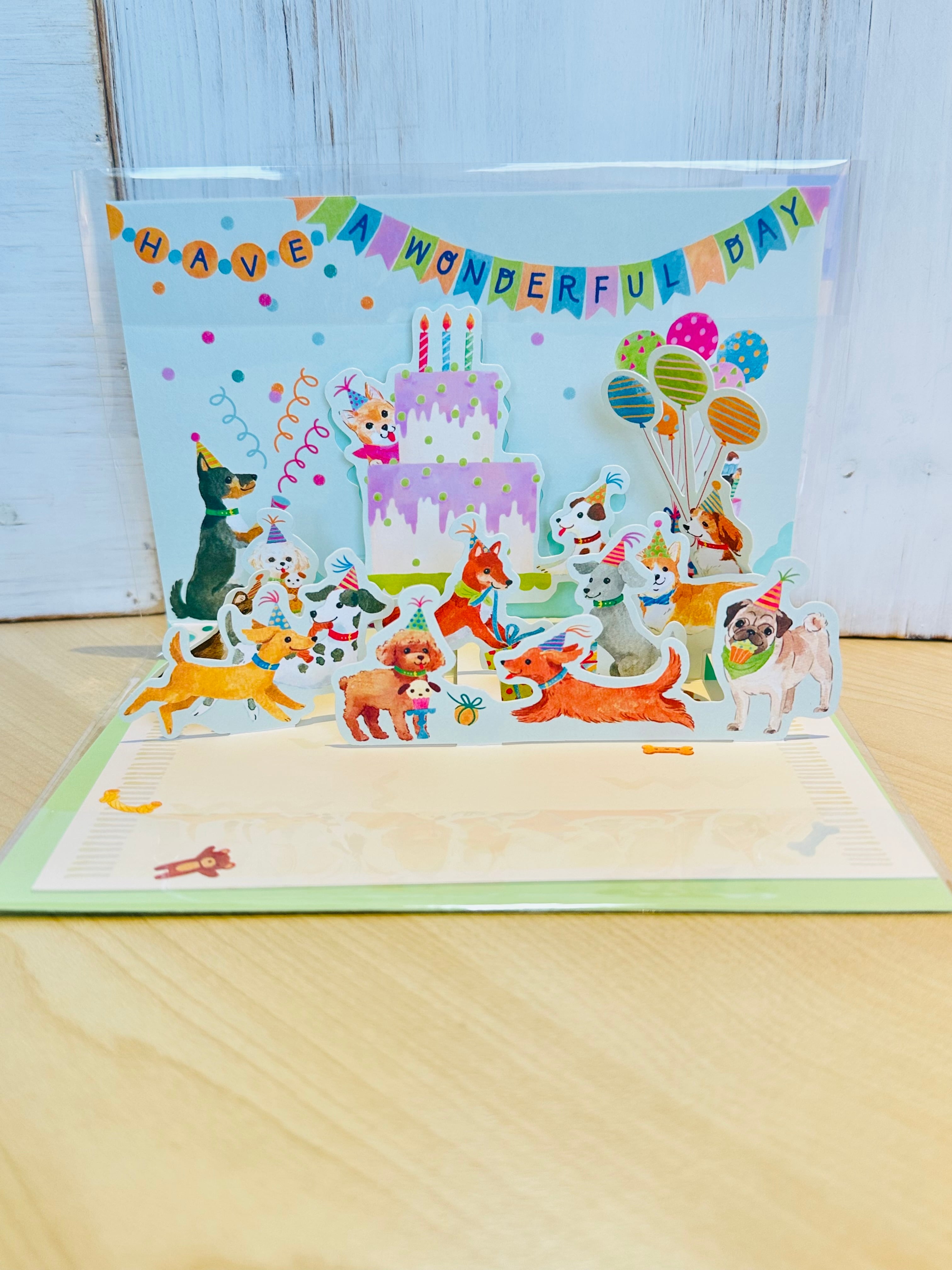 カードを開くとたくさんの犬が飛び出す、犬好きにはたまらないバースデーカードです。