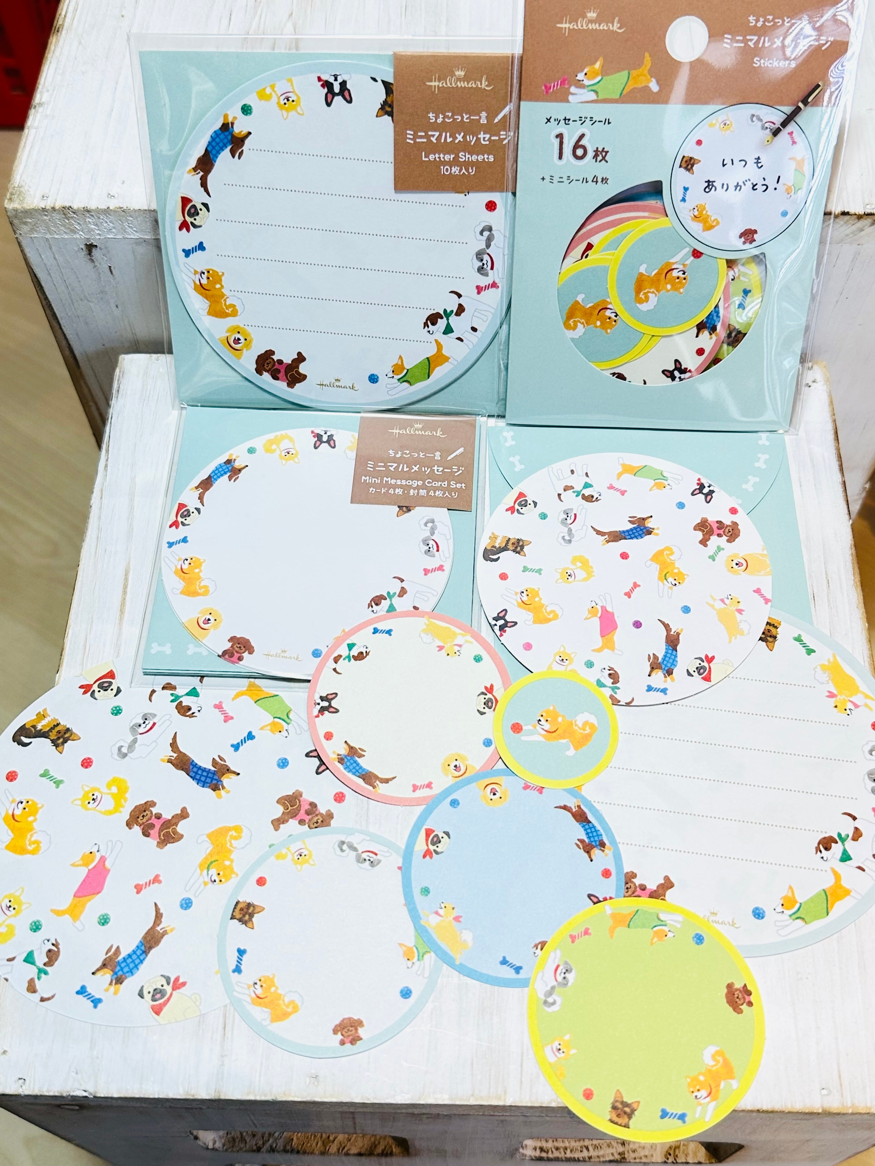 丸いカードをぐるっと囲んだわんこがかわいい、メッセージカードと封筒のセット。
