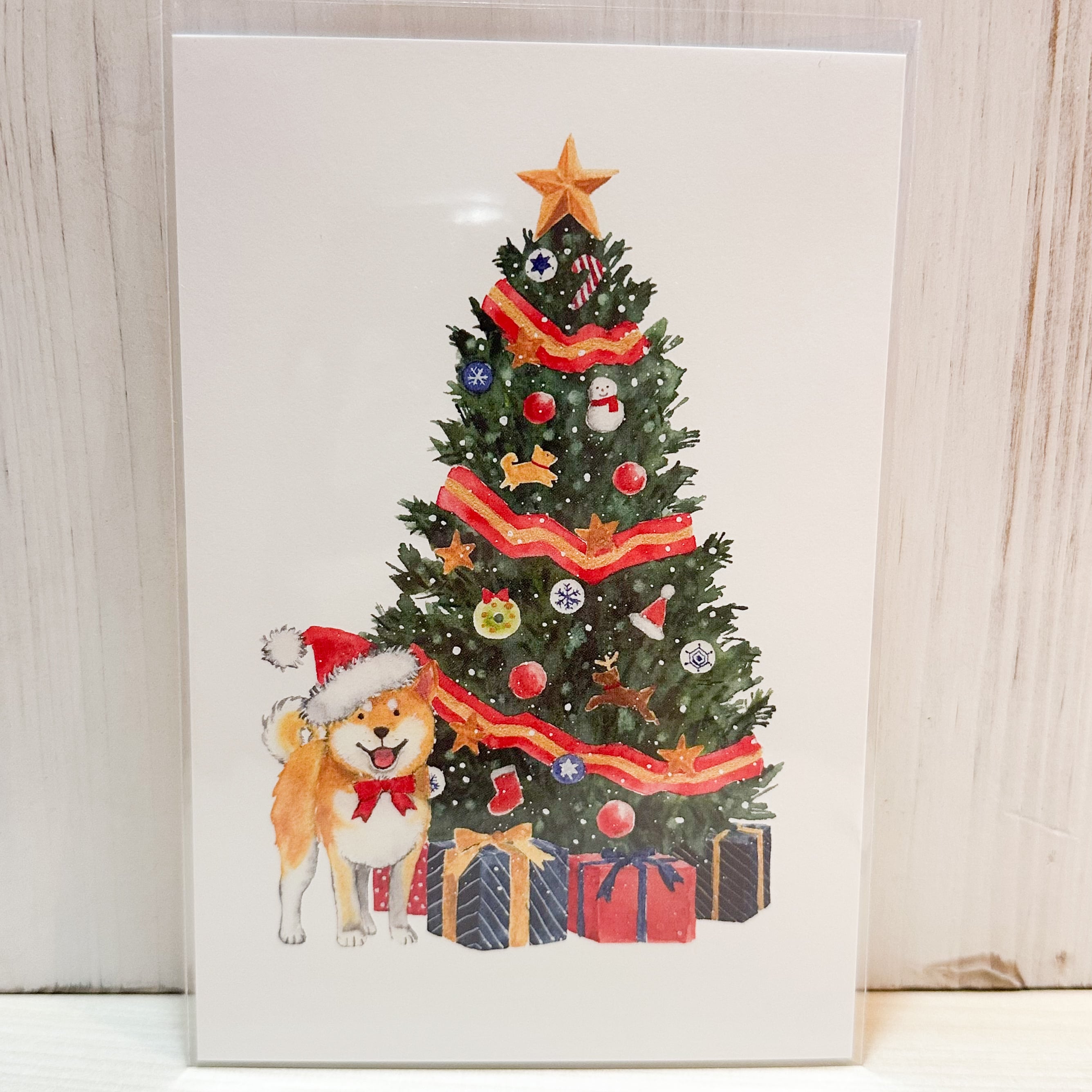 クリスマスを楽しむ柴犬たちがかわいい、人気イラストレーター村田なつかの繊細な水彩画ポストカードです。