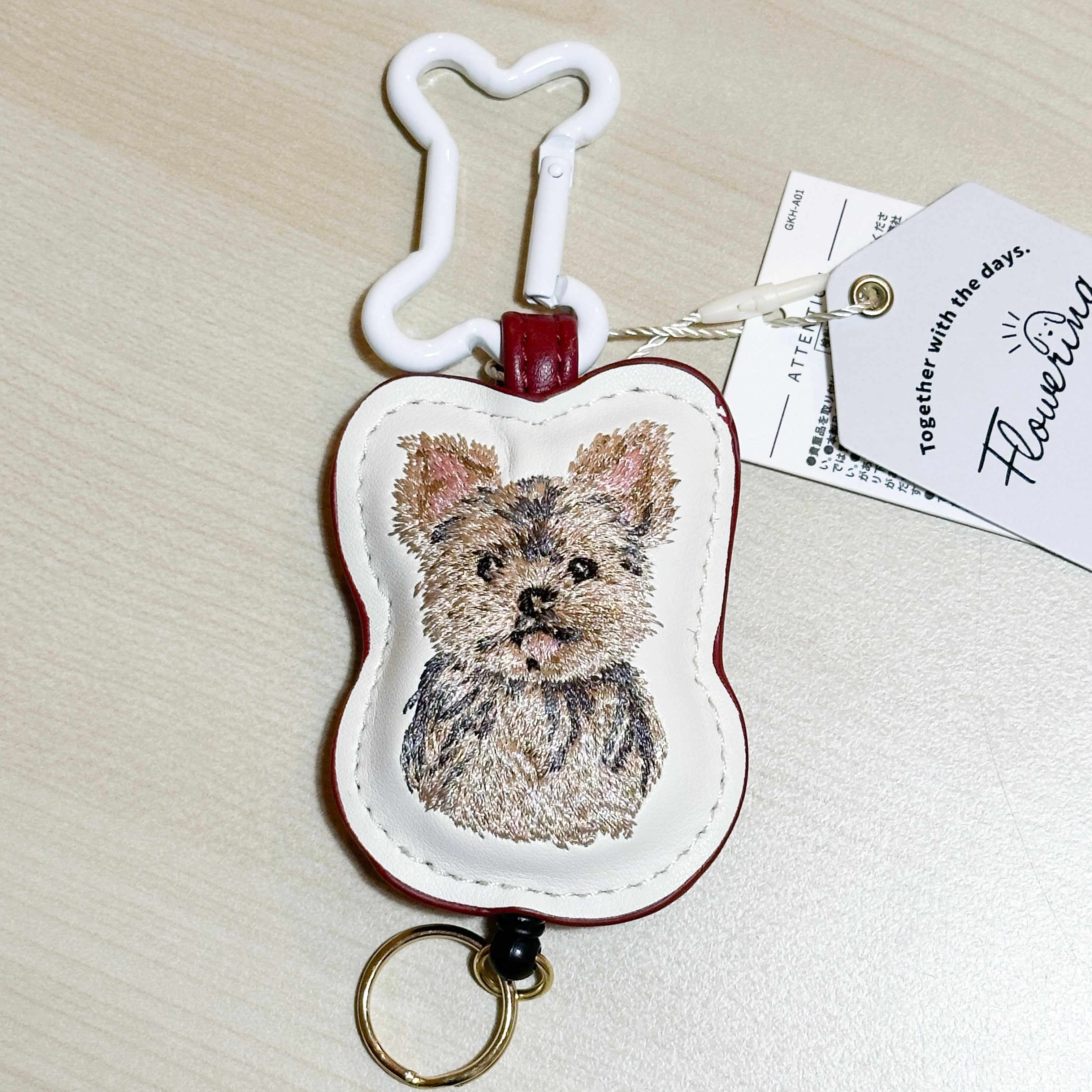 綿入りの合成皮革に、わんこのリアルな刺繍がかわいい骨型カラビナ付きリールチャーム。