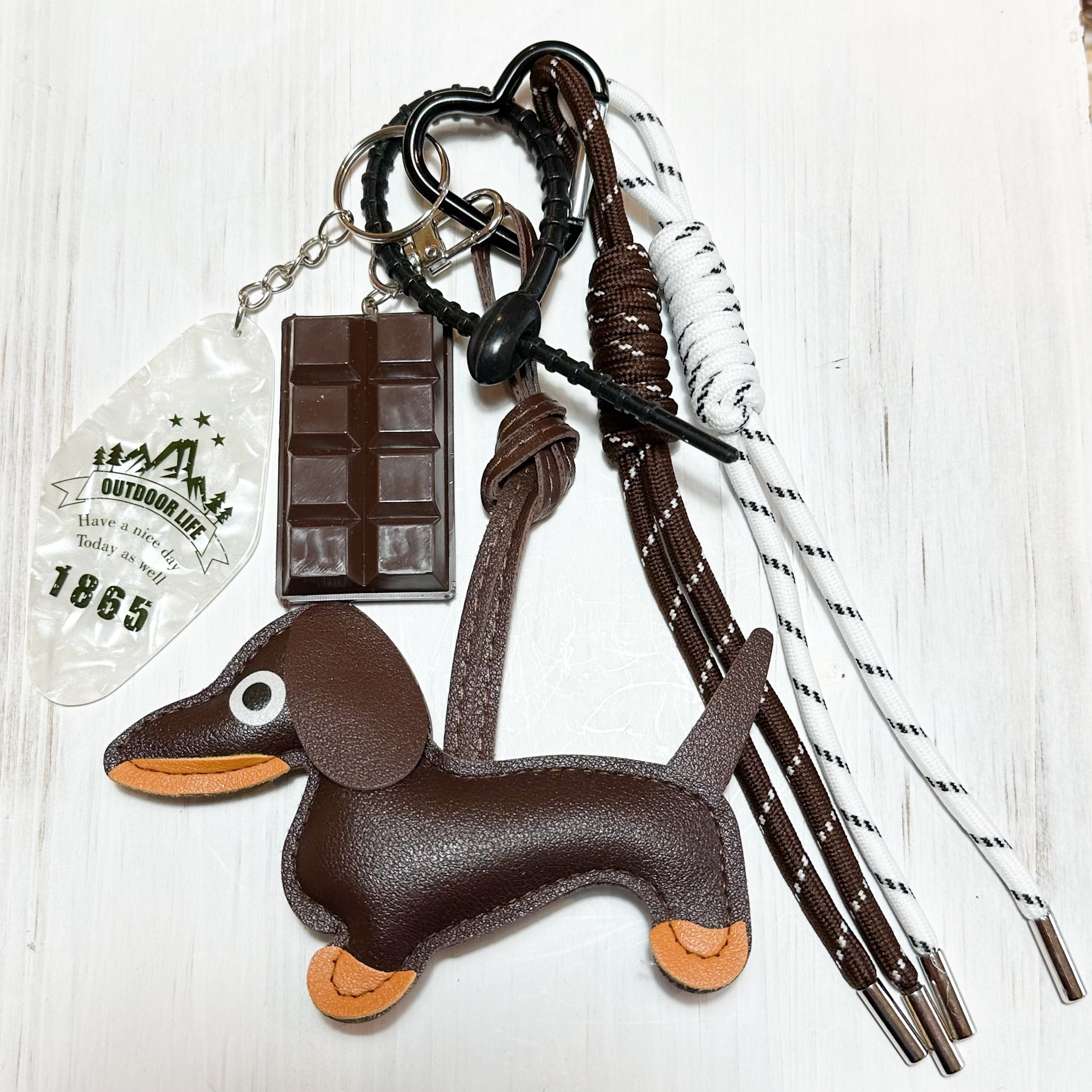 合皮のダックスのマスコットといろいろなパーツの組み合わせがかわいい、存在感のあるバッグチャーム。ハート型カラビナ付き。