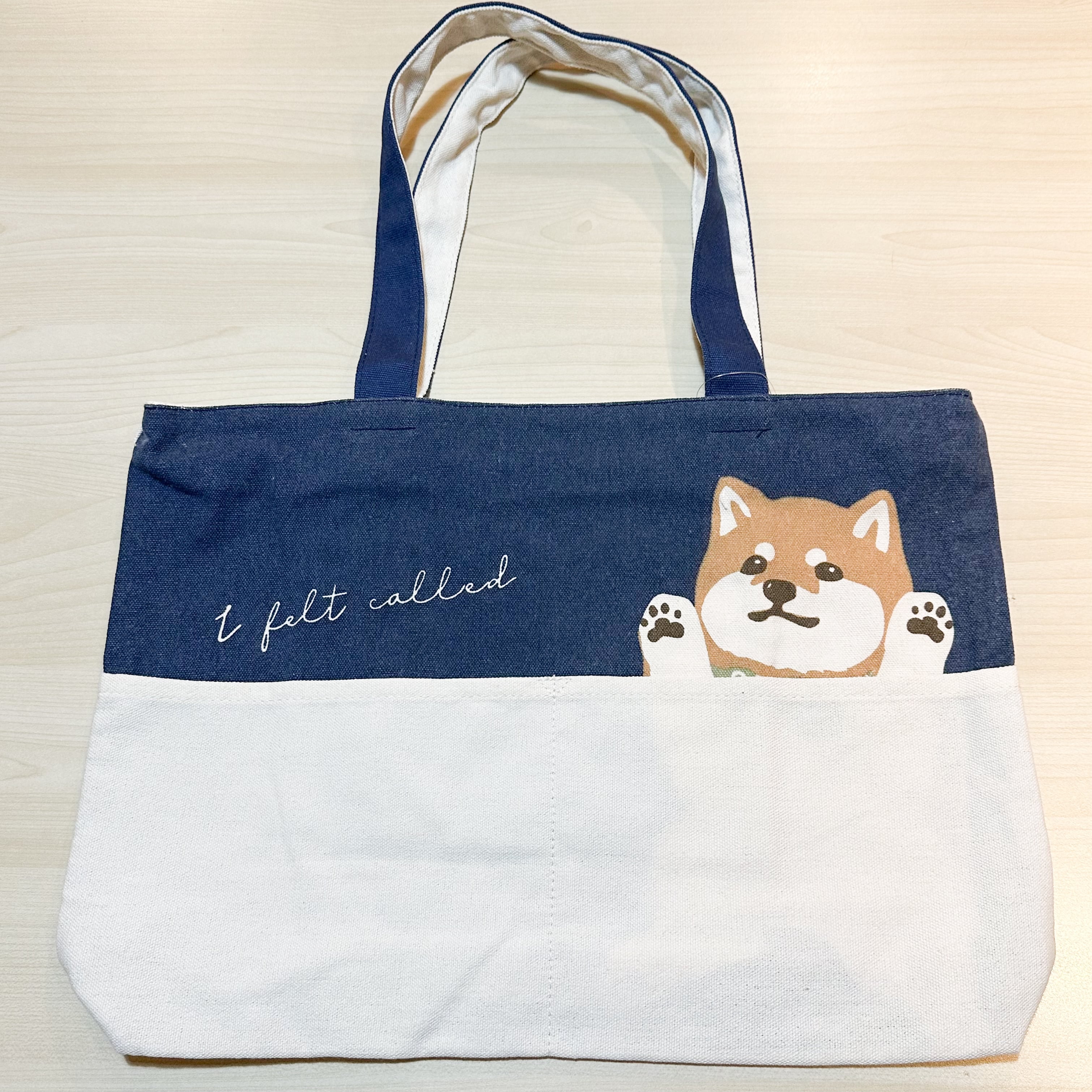 まめしばのコータくんがポケットから見える、かわいいデザインのヨコ型トート。