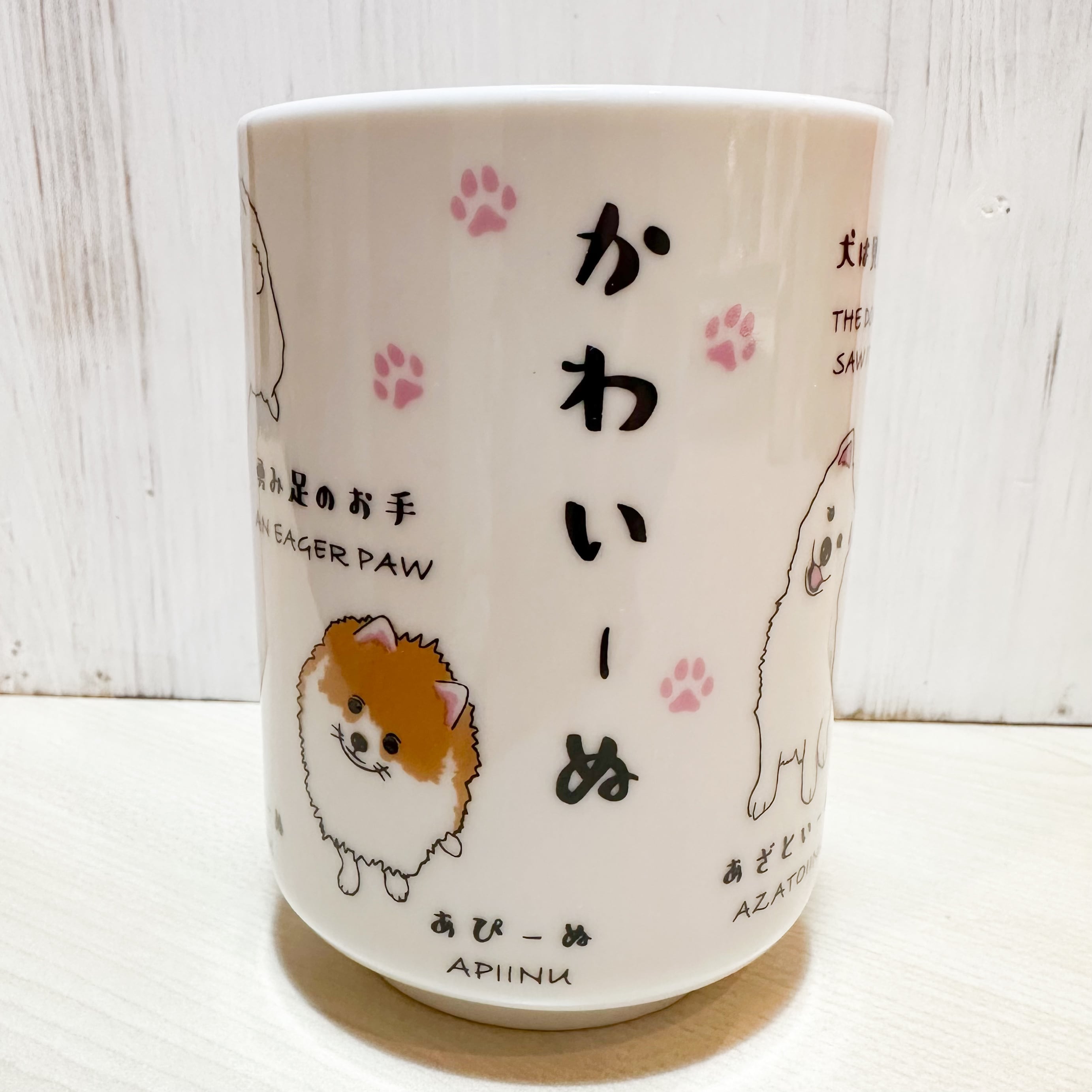 わんこたちの、かわいい仕草がぐるっと描かれた湯呑。