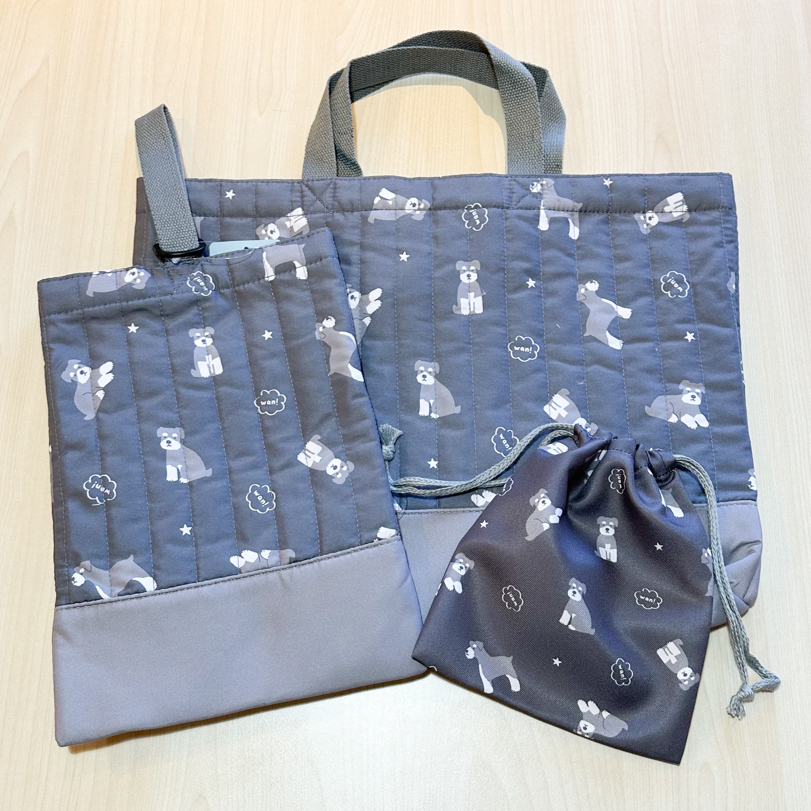 グレーにかわいいシュナウザー柄のキルティングシューズケース。