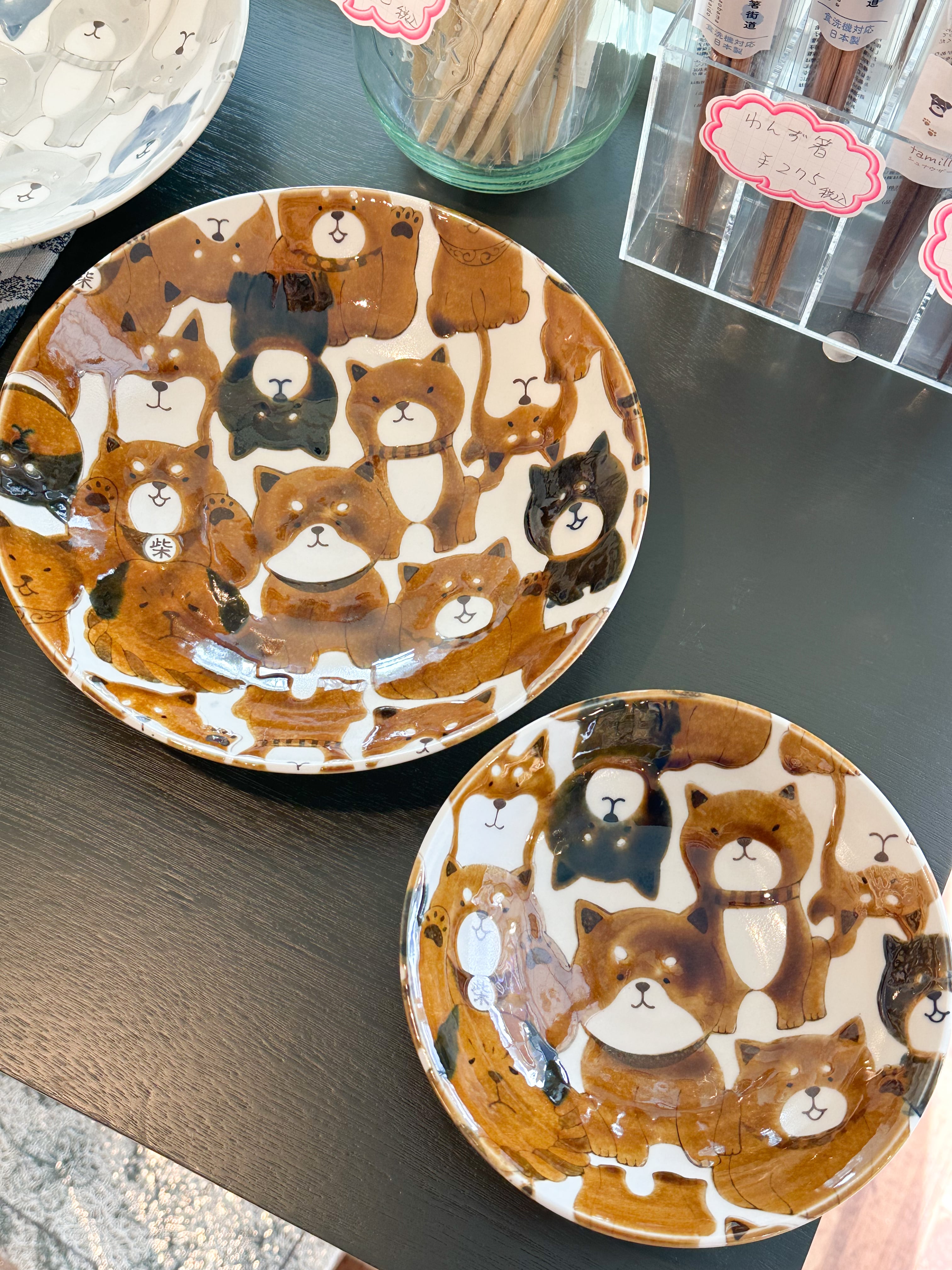 まんまる顔の犬たちがかわいい『わんわん』シリーズは、柴犬たちが大胆に描かれた食器。