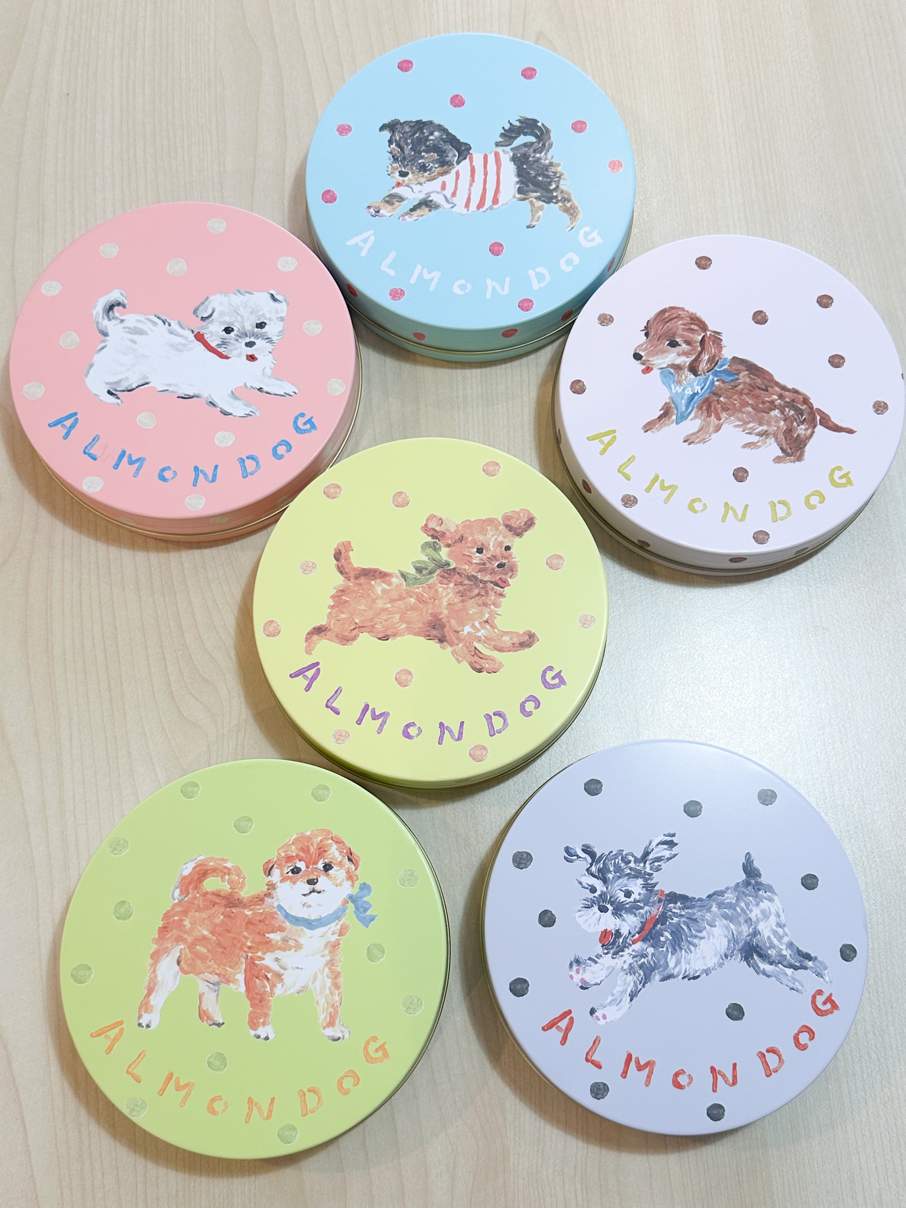 かわいいわんこのイラストの丸缶に、アーモンドひとつひとつをキャラメルでコーティングし、オリジナルチョコレートで包み込んだアーモンドッグ(お菓子の名前)が入っています。