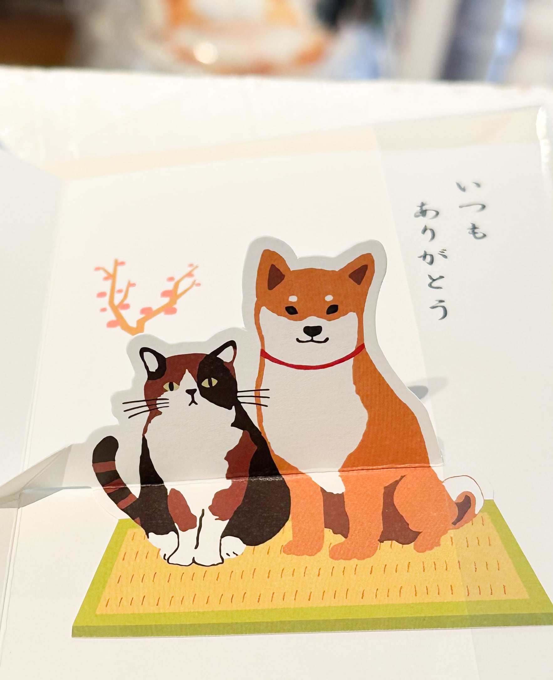 柴犬の柴田さんと、三毛猫の三宅さんが カードを開くと感謝をこめておじぎをしてくれるなんとも可愛らしいデザイン。 「いつもありがとう」のメッセージ付きで、もらった方に喜ばれること間違いなしです。