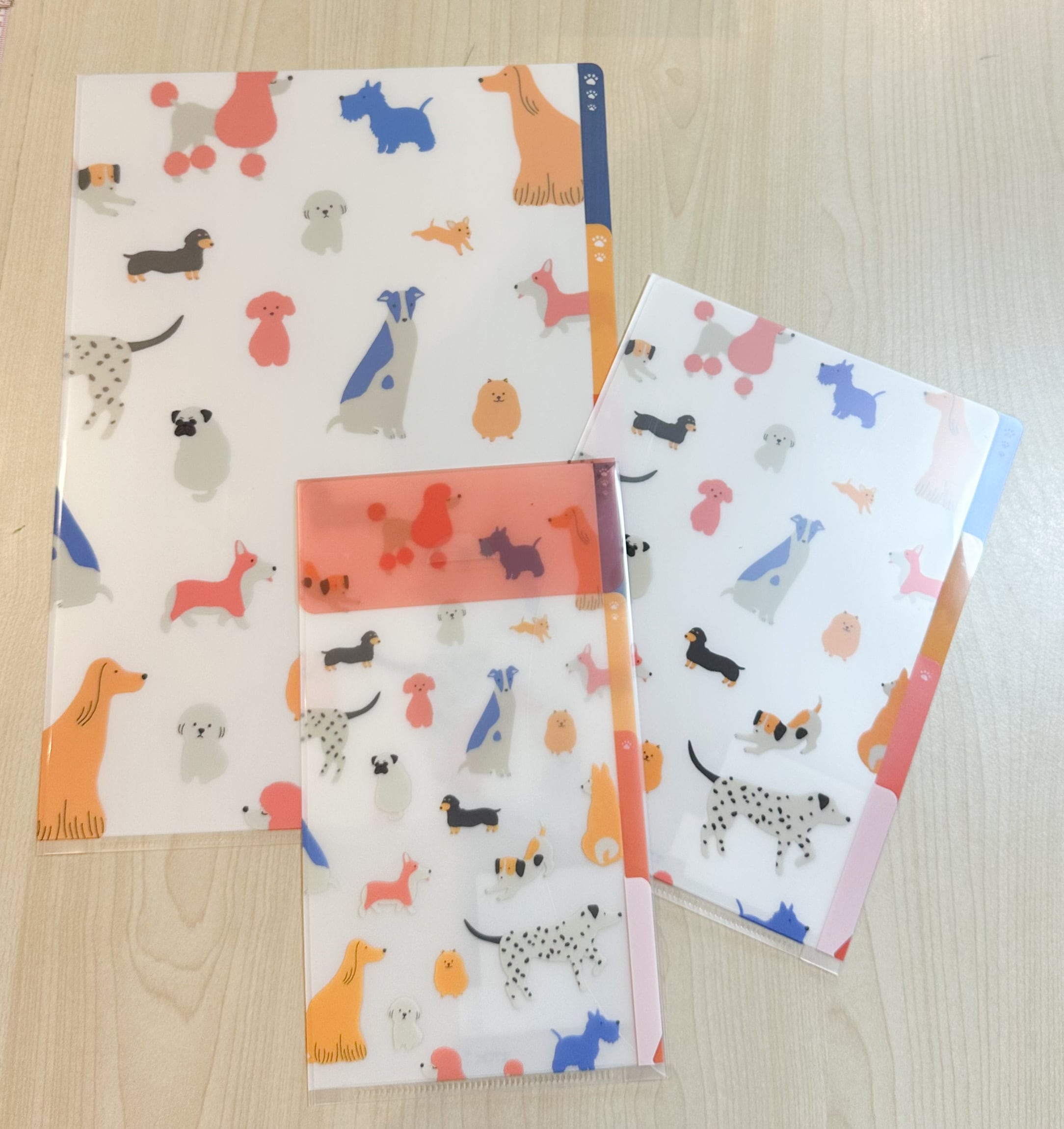 カラフルなわんこ柄がかわいい、A4クリアホルダー 。