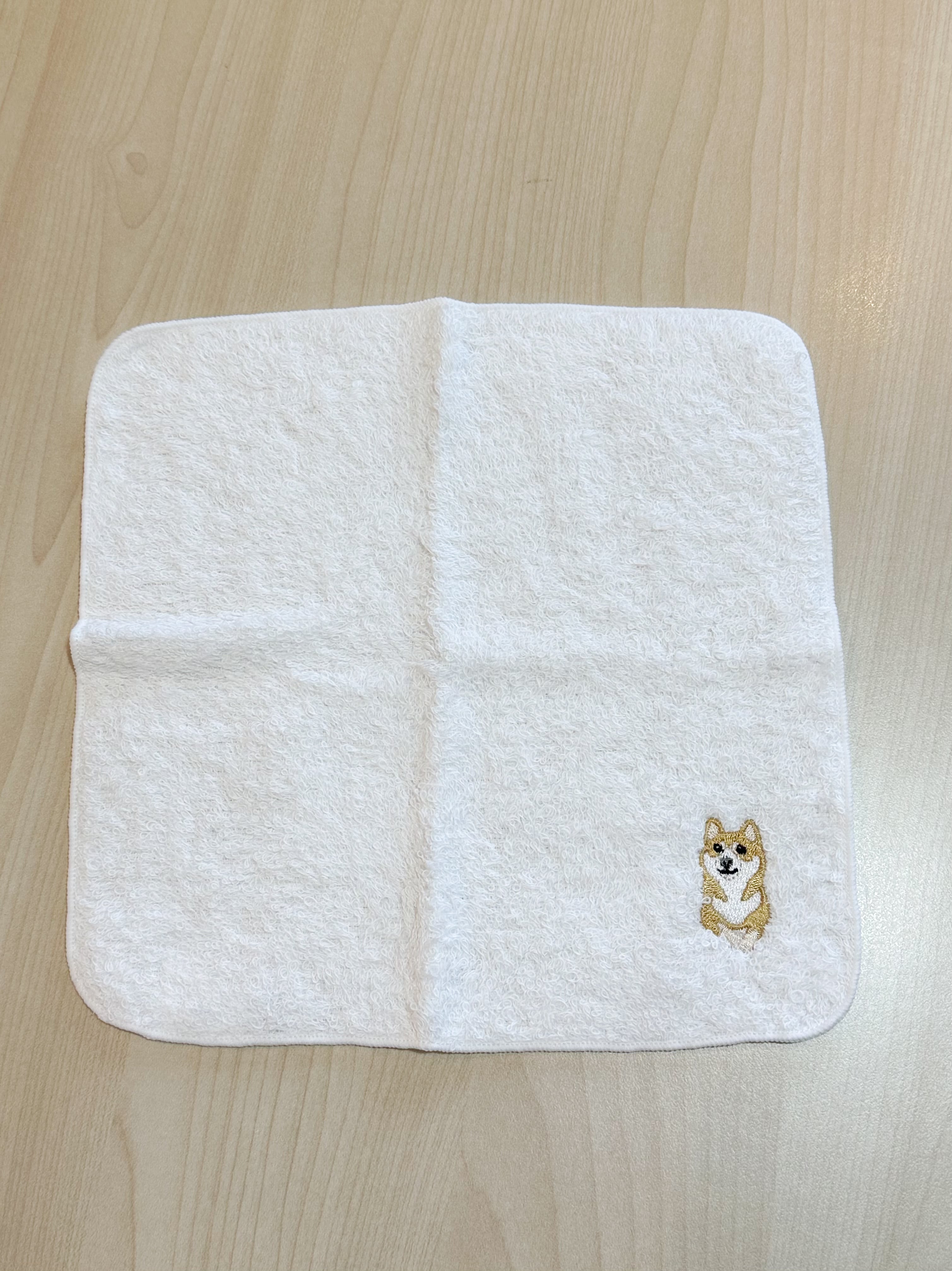 かわいいわんこの刺繍が付いた、ハンカチタオル。