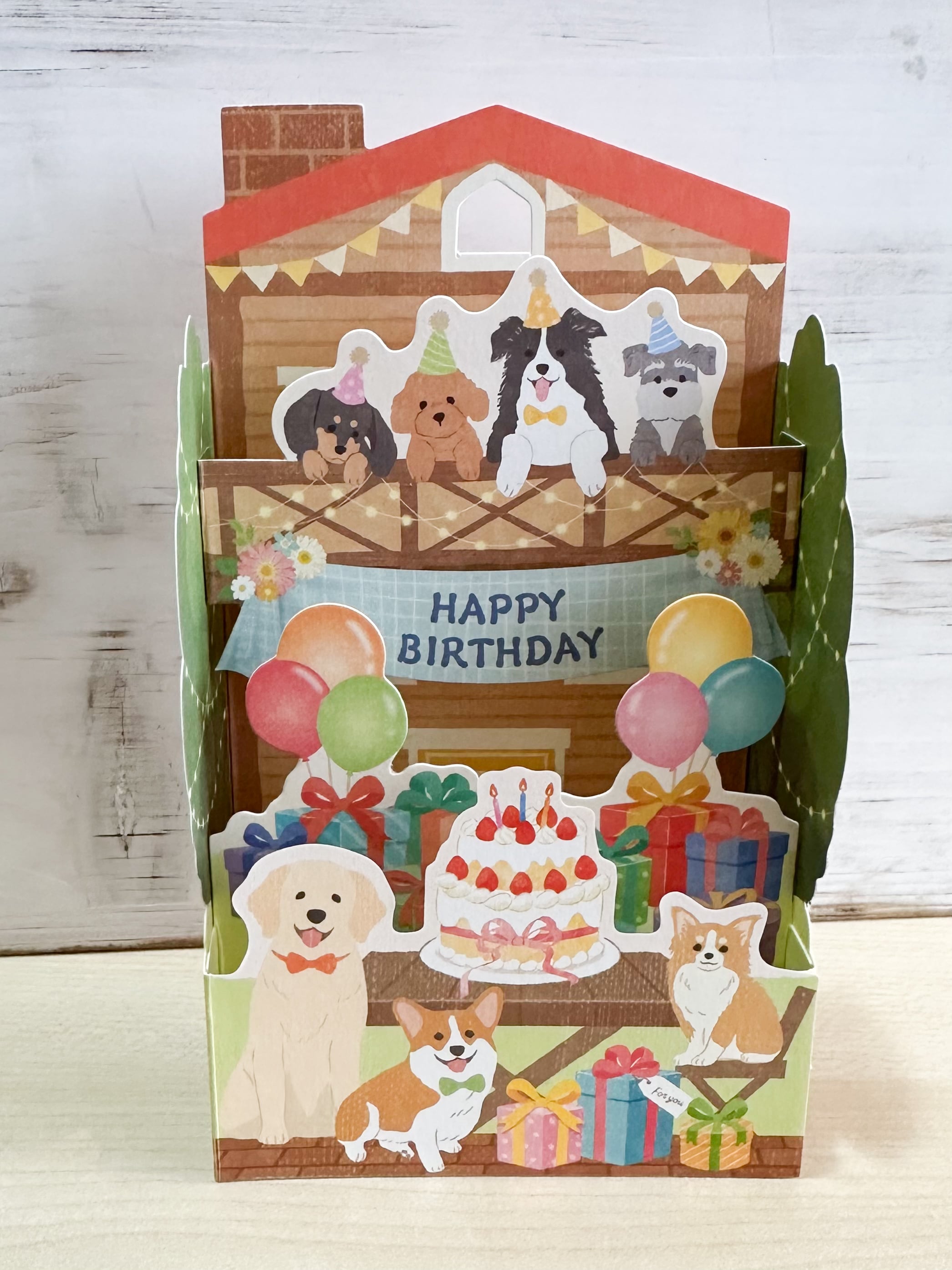 かわいいわんこたちがパーティーを開いて誕生日をお祝いしてくれるデザインです。