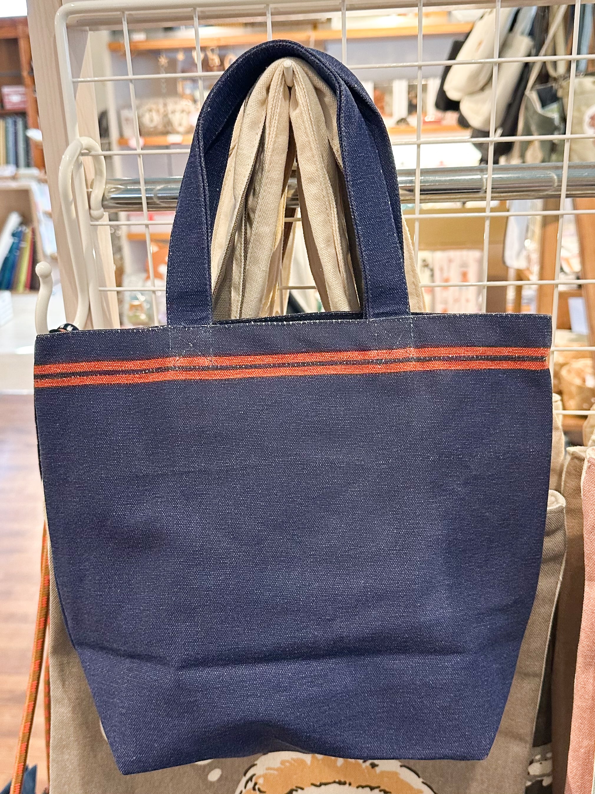 前かけ風の柴田さん柄がユニークで親しみやすい、ミニトートのひとまわり大きいサイズのトートM。しっかりしたキャンバス生地です。