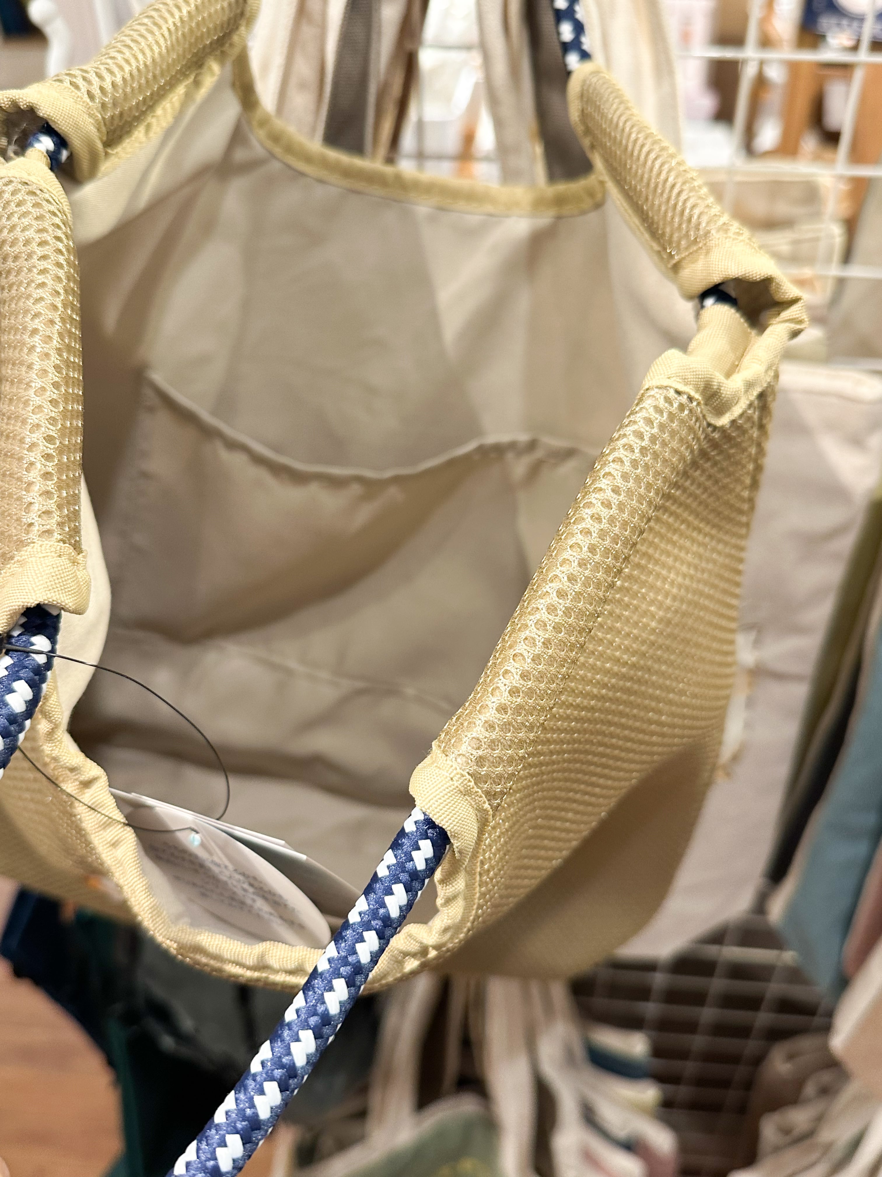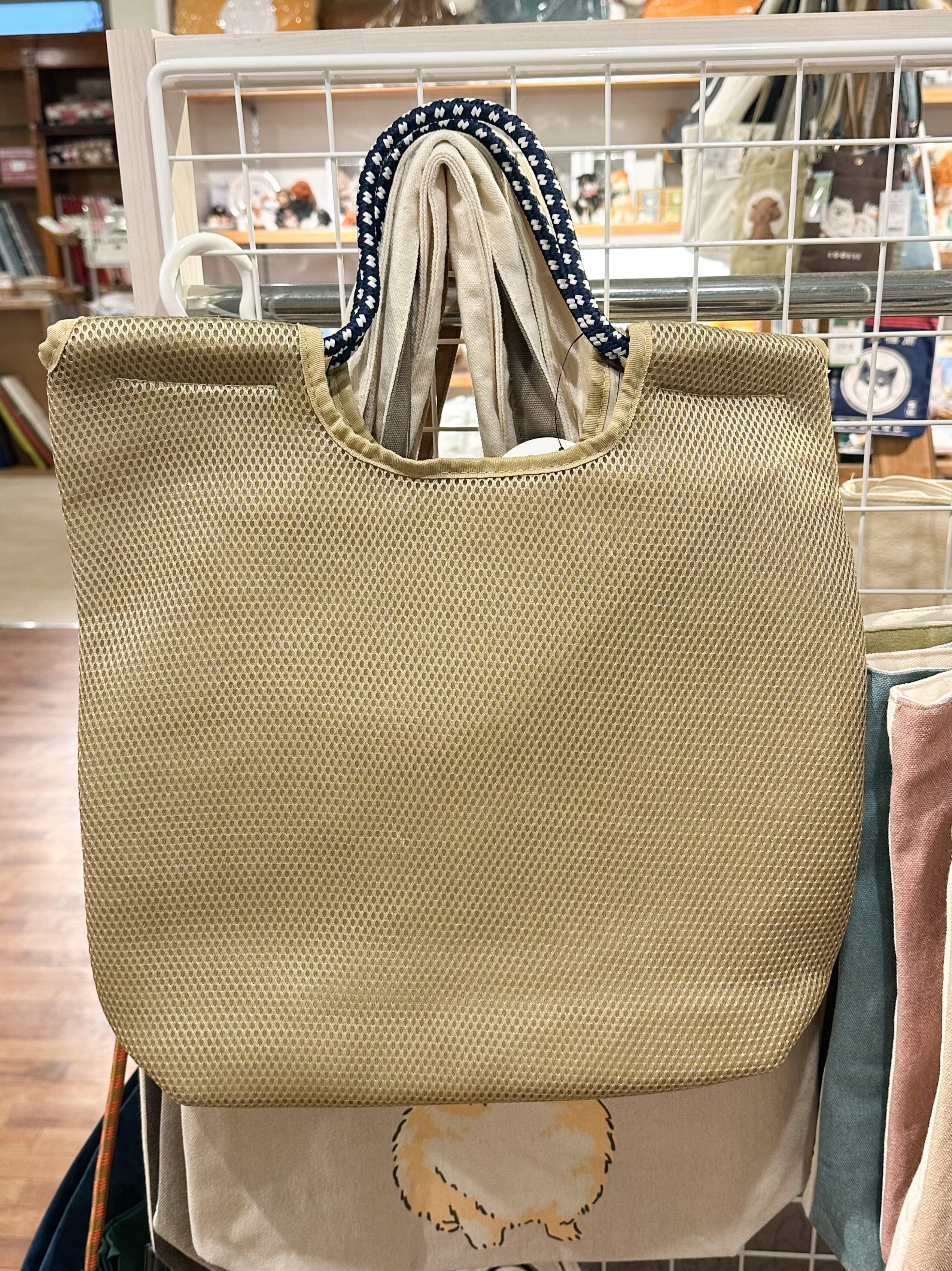 A cord tote with a cute dog embroidery with a charming expression on the mesh material. The code of the handle is the point.