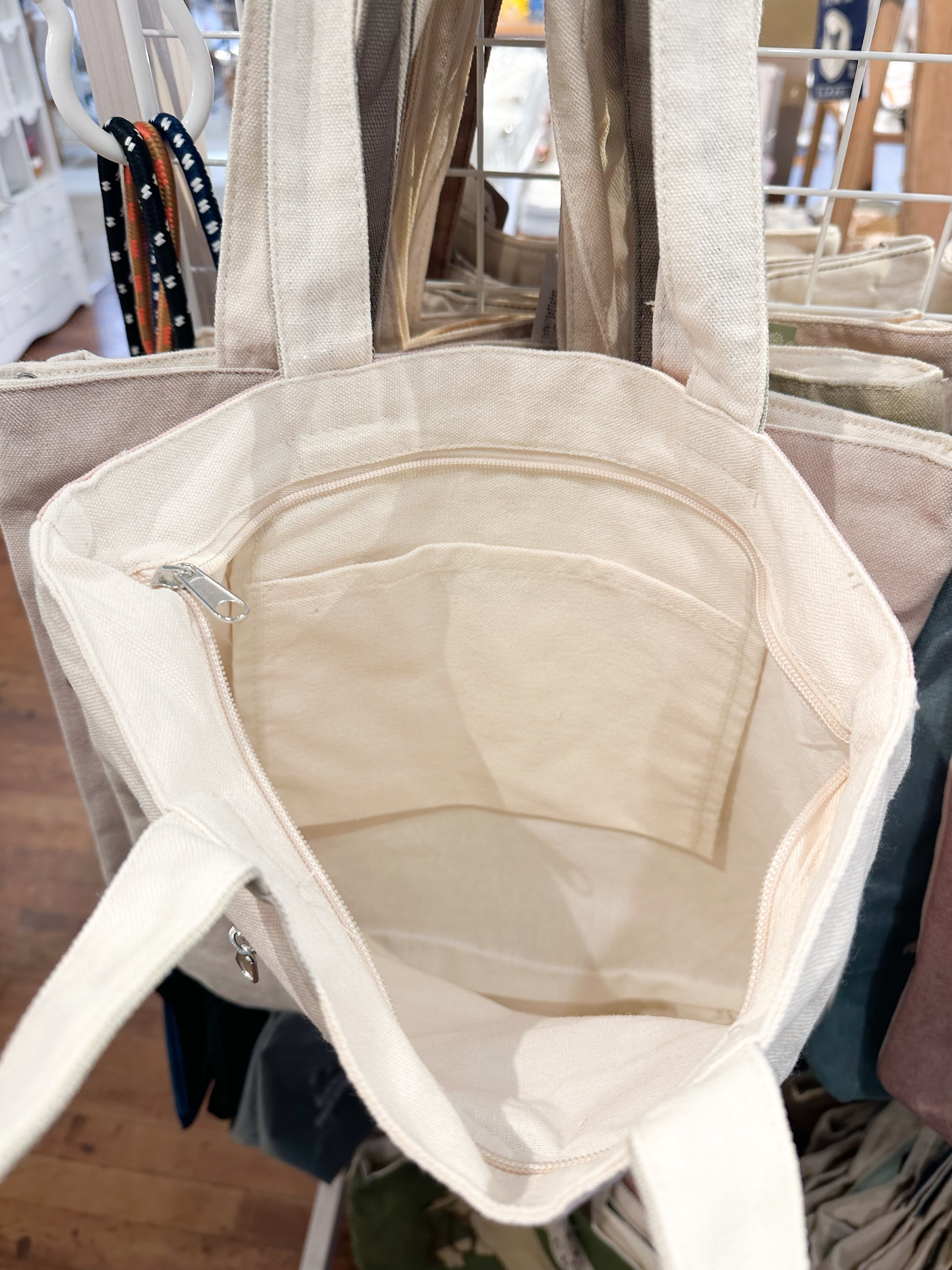 A cute canvas tote bag with a pocket for a smartphone on the front.