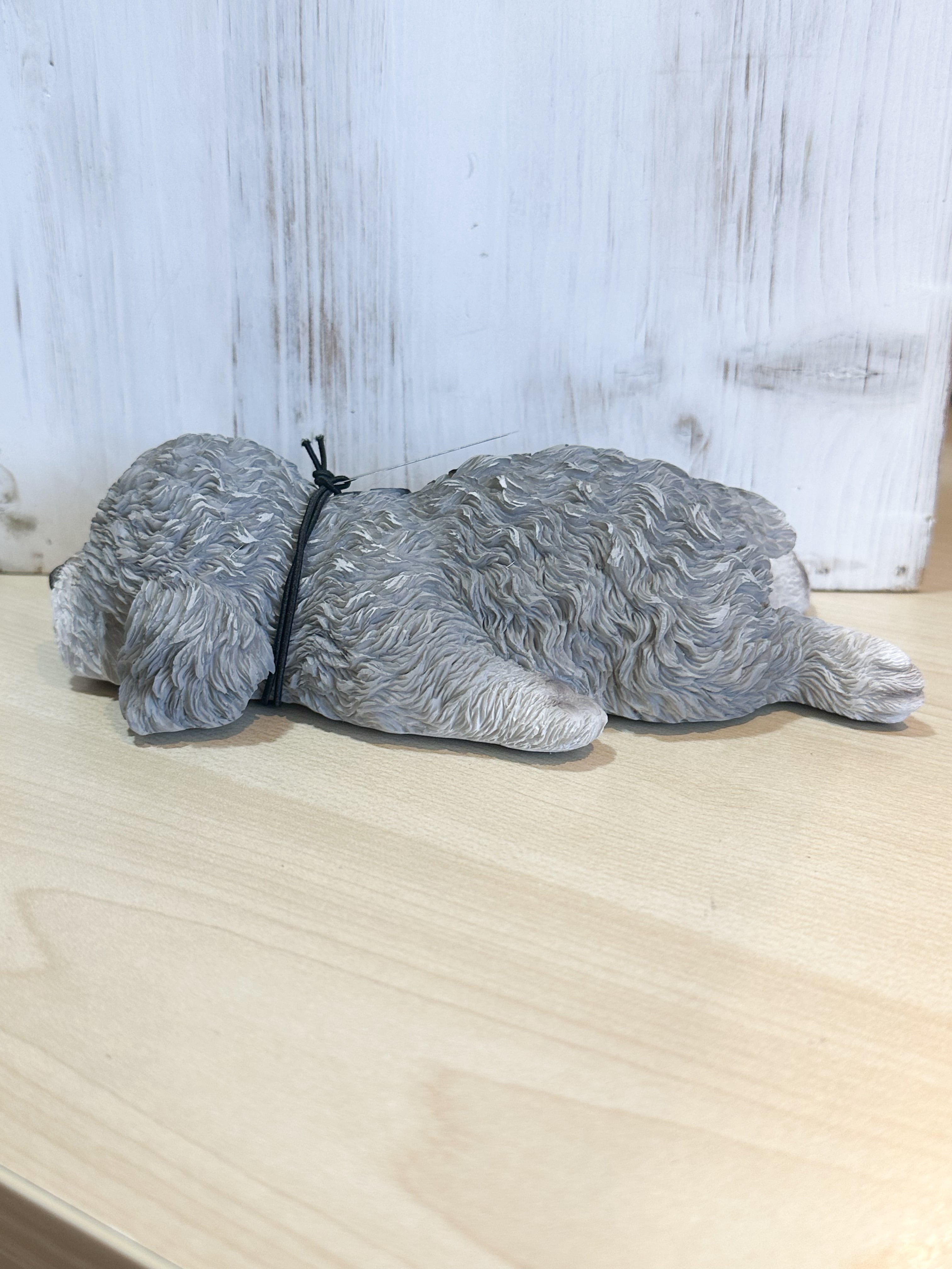 A figurine of a cute toy poodle in a prone pose. ( There is no magnet in this one.)