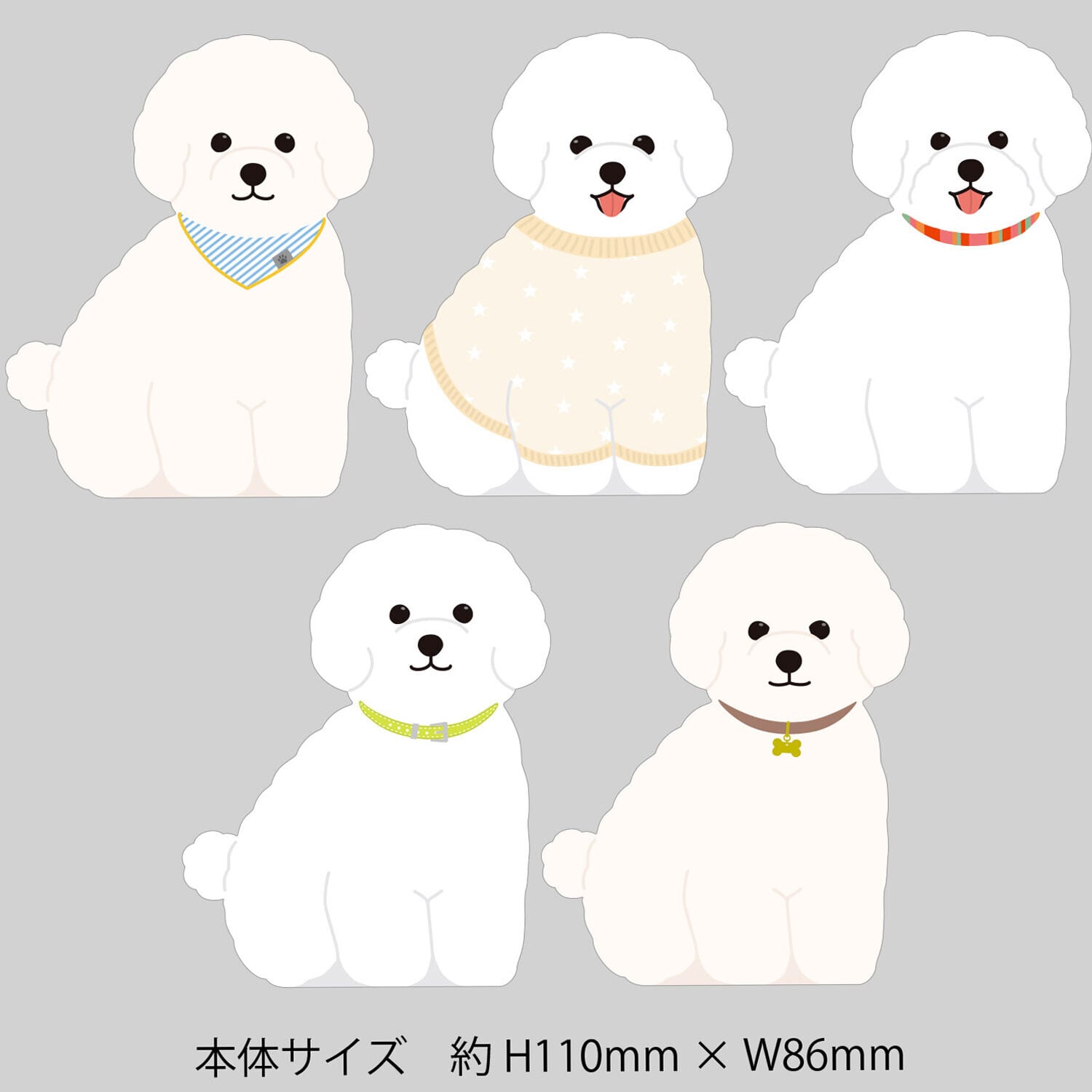 ビションの絵柄や表情が違う5柄のメモが楽しめます。天糊製本なので1枚ずつメモを切り離して使うこともできます。